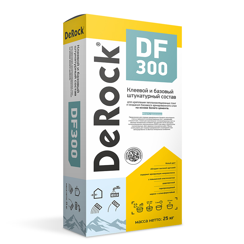 Клеевой и базовый штукатурный состав DeRock DF200 предназначен для создания армированного базового штукатурного слоя на поверхности теплоизоляционных плит с армирующей стеклосеткой, а также для приклеивания теплоизоляционных плит на обычные минеральные основания при монтаже систем фасадных теплоизоляционных композиционных (СФТК) при новом строительстве и реконструкции. Для наружных и внутренних работ. Можно использовать для создания армированного штукатурного слоя непосредственно на обычных минеральных основаниях.