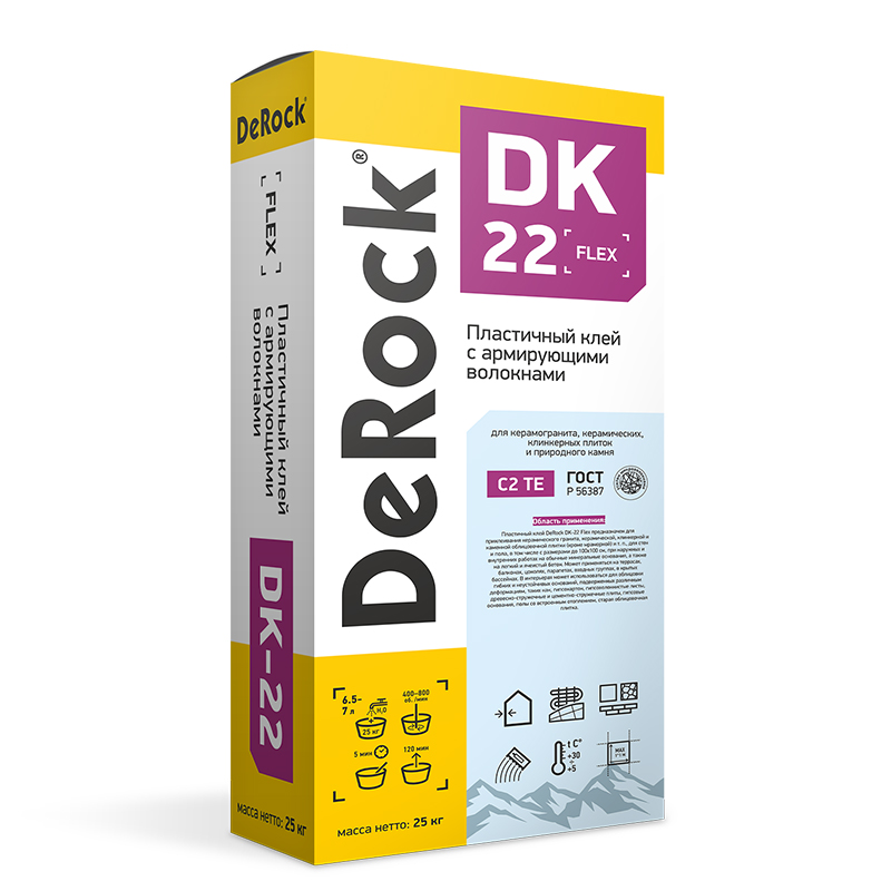 Пластичный клей DeRock DK-22 Flex предназначен для приклеивания керамического гранита, керамической, клинкерной и каменной облицовочной плитки (кроме мраморной) и т. п., для стен и пола, в том числе с размерами до 100х100 см, при наружных и внутренних работах на обычные минеральные основания, а также на легкий и ячеистый бетон. Может применяться на террасах, балконах, цоколях, парапетах, входных группах, в крытых бассейнах. В интерьерах может использоваться для облицовки гибких и неустойчивых оснований, подверженных различным деформациям, таких как, гипсокартон, гипсоволокнистые листы, древесно-стружечные и цементно-стружечные плиты, гипсовые основания, полы со встроенным отоплением, старая облицовочная плитка.