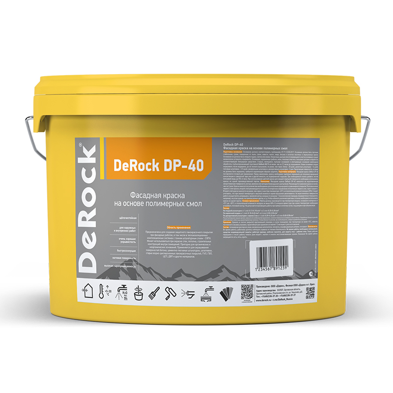 Фасадная краска DeRock DP-40 предназначена для создания защитного лакокрасочного покрытия при фасадных работах, в том числе в теплоизоляционных композиционных системах с тонким штукатурным слоем - СФТК. Может использоваться при окраске стен, потолка, строительных конструкций внутри помещений. Пригодна для органических и неорганических оснований. Применяется для окрашивания поверхностей бетона, цементно-песчаных штукатурок, шпатлевки, старых водно-дисперсионных лакокрасочных покрытий, ГКЛ, ГВЛ, ЦСП, ДВП и других материалов.