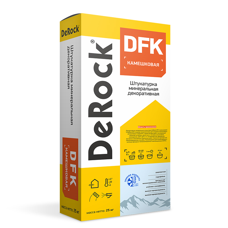 Декоративные минеральные штукатурки DeRock DFК-W (камешковая) и DeRock DFК-W (короед) предназначены для создания тонкослойных декоративных покрытий с зернистой фактурой с последующей окраской на бетоне, цементных и гипсовых штукатурках, гипсокартоне, ДСП, ЦСП и т.п. основаниях при проведении фасадных и внутренних отделочных работ. Наносится вручную или механизированным способом. Используется при температуре воздуха и основания от -10° C до +20° C. Рекомендуется для использования в системах фасадных теплоизоляционных композиционных (СФТК).